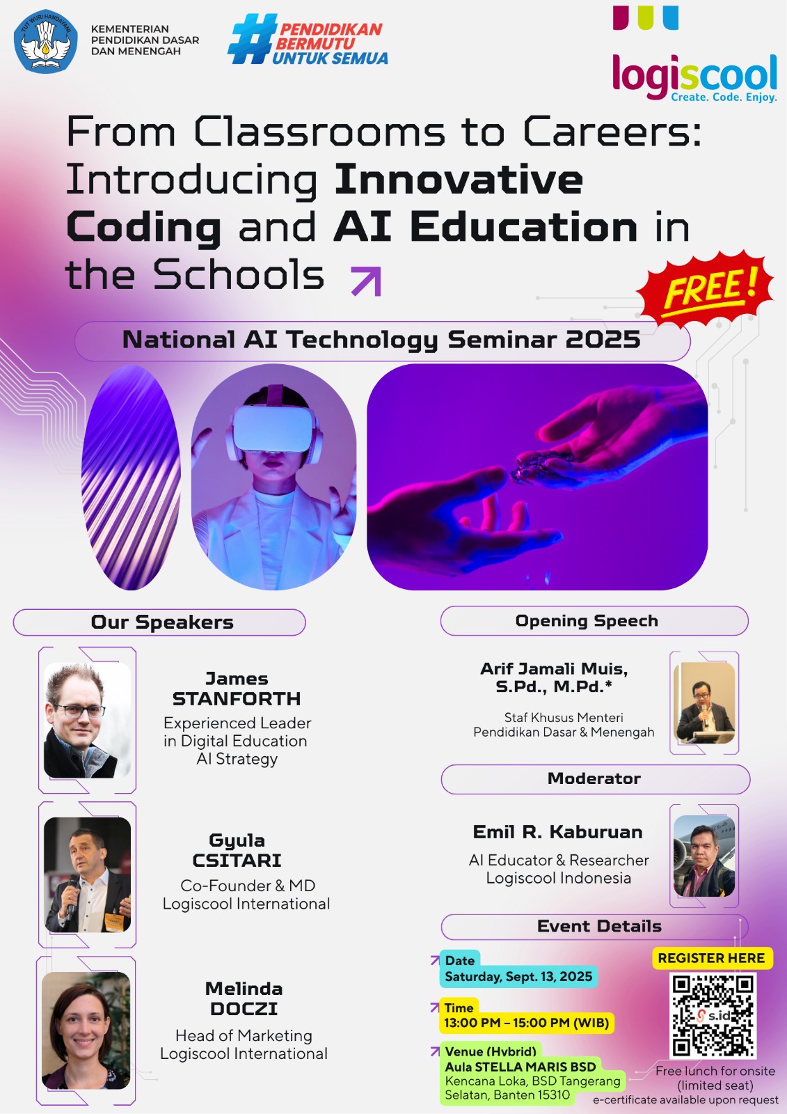 Tangerang Selatan, MCI.com – Logiscool Indonesia, lembaga pendidikan coding dan AI dengan tagline “Create, Code, Enjoy”, akan menggelar seminar nasional bertema “From Classrooms to Careers: Introducing Innovative Coding and AI Education in the Schools, National AI Technology Seminar 2025”. Acara ini dirancang untuk mendiskusikan peran krusial pendidikan digital, khususnya di bidang coding dan AI, dalam membentuk masa depan karier generasi muda.