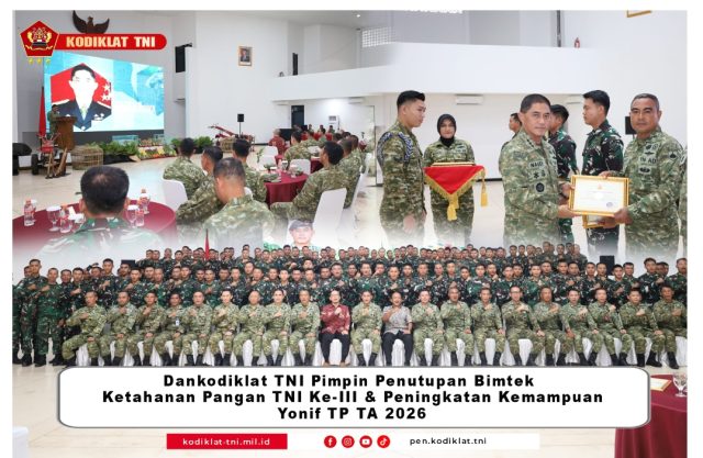 TANGSEL, Mediacenterinfo.com (MCI) – Komandan Kodiklat TNI Letjen TNI Mohamad Naudi Nurdika pimpin penutupan Bimbingan Teknis (Bimtek) Ketahanan Pangan TNI ke-III dan Peningkatan Kemampuan Yonif TP T.A. 2026 secara resmi di gedung Yos Soedarso, Serpong Tangerang Selatan, Jum’at (10/4/2026).