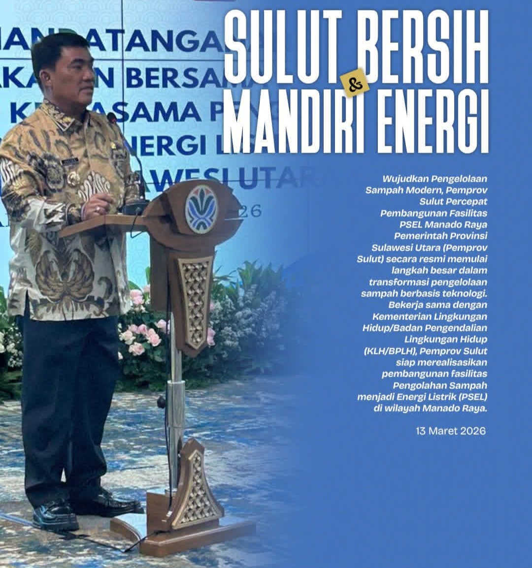 โ€Žโ€œKami sangat mengapresiasi dukungan penuh dari Bapak Menteri KLH/BPLH, melalui progam PSEL, sampah tidak lagi dipandang sebagai beban atau ancaman bagi masyarakat, melainkan sumber daya yang bernilai ekonomi dan energi. Ini adalah wujud komitmen kami untuk menghadirkan lingkungan yang bersih sekaligus mandiri energi di Sulawesi Utara,โ€ ujar Gubernur YSK.